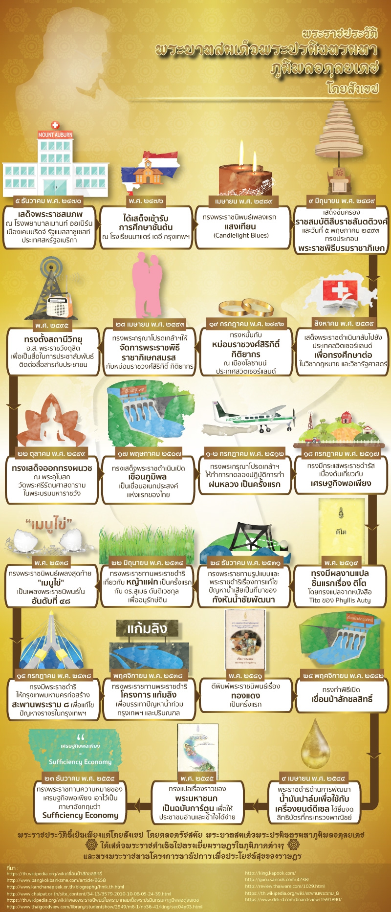 พระราชประวัตินี้เป็นเพียงแต่โดยสังเขป โดยตลอดรัชสมัย พระบาทสมเด็จพระปรมินทรมหาภูมิพลอดุลยเดช ได้เสด็จพระราชดำเนินไปทรงเยี่ยมราษฎรในภูมิภาคต่างๆ และทรงพระราชทานโครงการนานัปการ เพื่อประโยชน์สุขของราษฎร และสำหรับท่านใดที่ต้องการค้นคว้าข้อมูลเพิ่มเติม สามารถเรียกดูได้ตามลิงก์ทางด้านล่างนี้เลยครับ